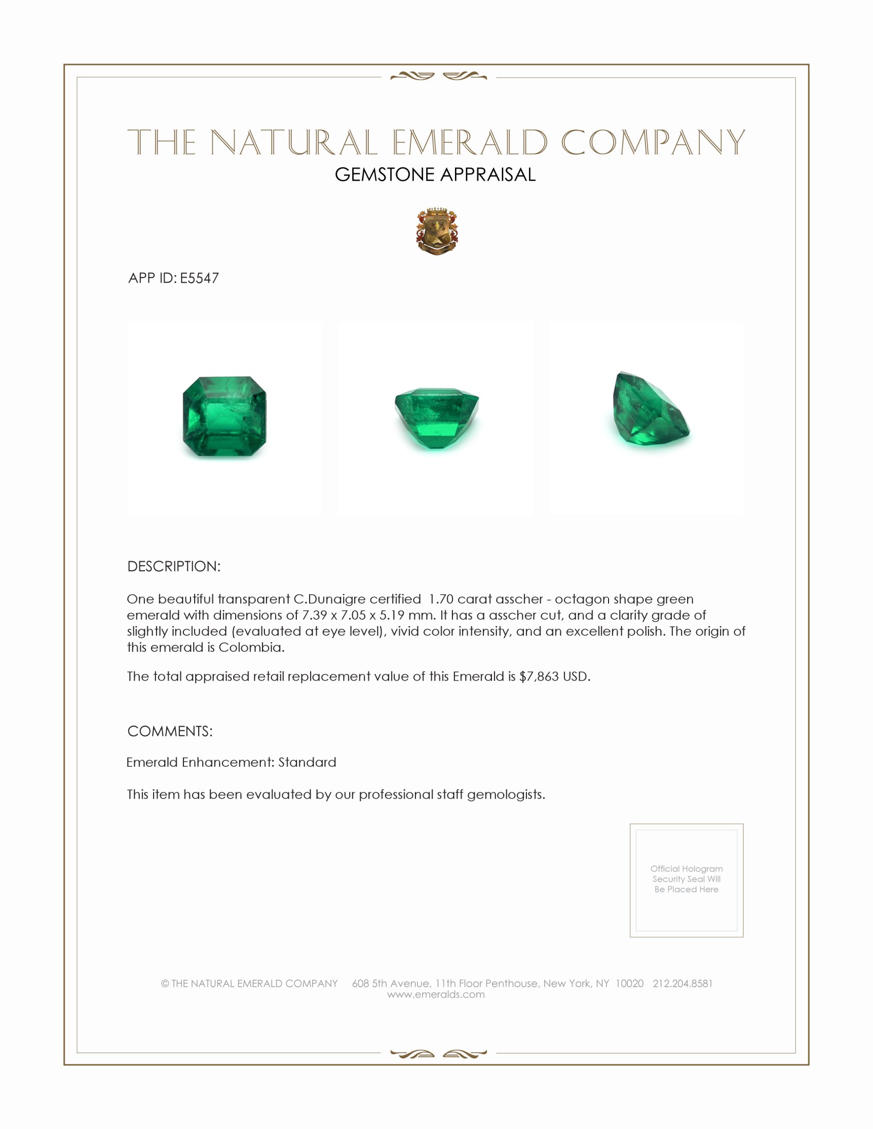 In the heart of the lush Colombian highlands, where the whispers of ancient forests mingle with the breath of the earth, lies the origin of a gemstone unlike any other. It is here, amidst the verdant emerald mines, that our remarkable asscher cut emerald begins its timeless journey. Certified by C. Dunaigre, this 1.70 carat treasure measures an elegant 7.39 x 7.05 x 5.19 mm and carries within it the echoes of a rich heritage. Colombia, renowned for producing the finest emeralds, offers a tableau of natural beauty and color found nowhere else. This region's gems are steeped in legend, lauded by royalty, and coveted by collectors for centuries.