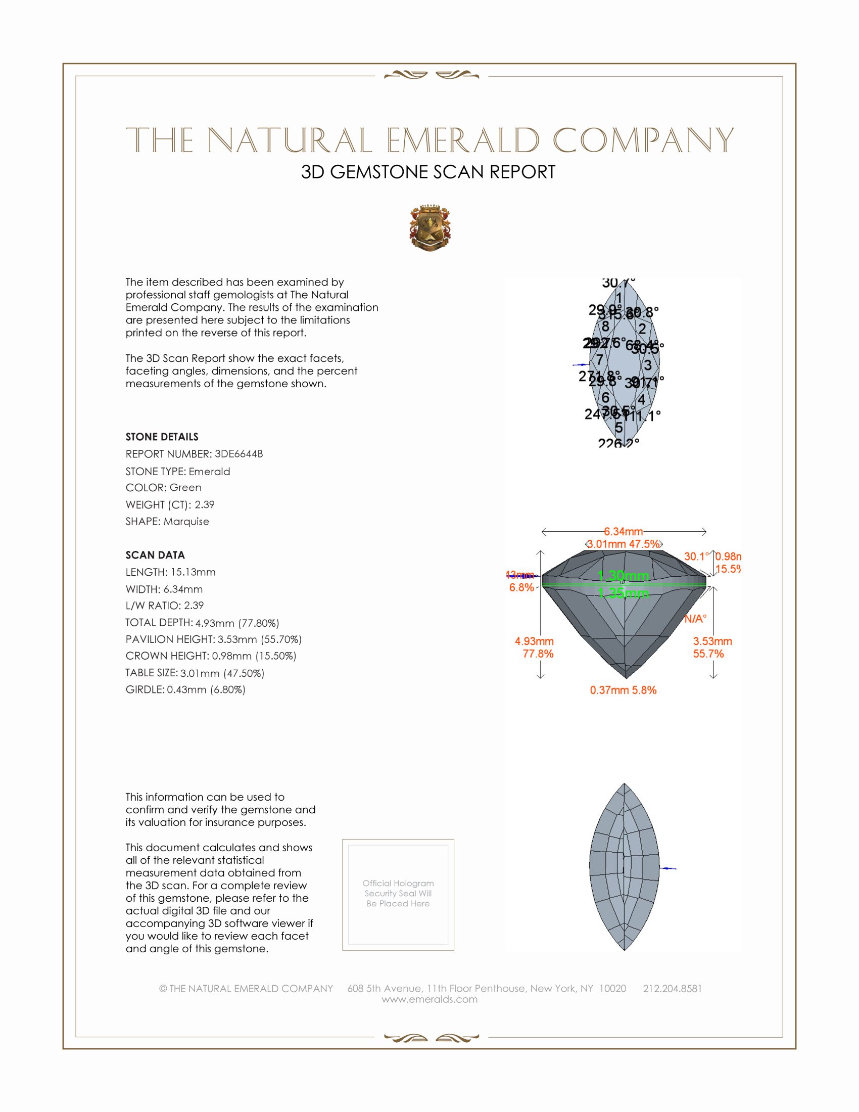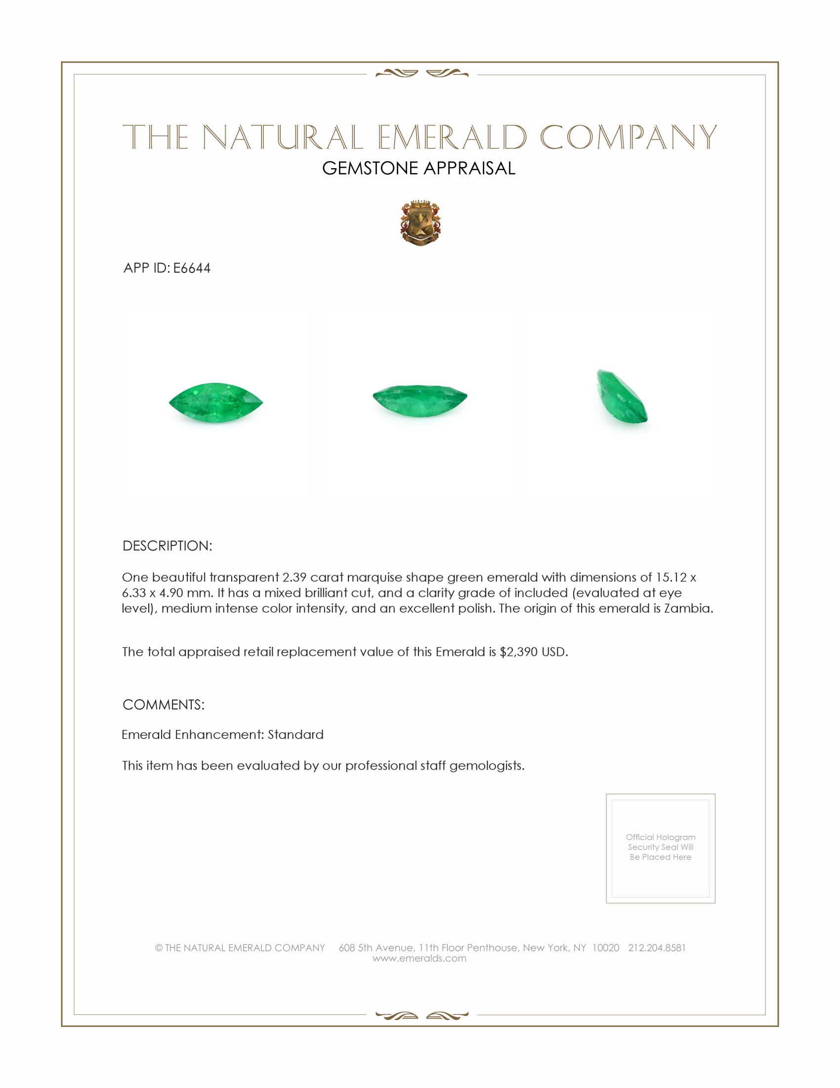 Introducing an exquisite gemstone that captivates the eye with its vibrant hue and unparalleled allure, this transparent 2.39 carat marquise shape emerald is a true testament to nature's artistry. Measuring 15.13 x 6.34 x 4.93 mm, this gemstone is crafted with a mixed brilliant cut, designed to maximize the play of light and showcase its natural brilliance. Its medium intense green color is both captivating and rare, a reminder of the lush landscapes from which it originates. This emerald hails from the renowned mines of Zambia, a region celebrated for producing some of the most exceptional emeralds in the world, adding a distinct layer of allure and prestige to this gem.