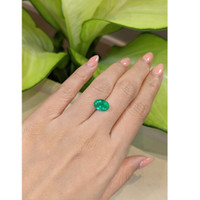 The mixed brilliant cut employed in this oval shape is designed to maximize light return while preserving the depth and saturation of the green hue. Facets on the crown and pavilion are proportioned to encourage lively reflections without sacrificing the stone s internal color distribution, creating a pleasing interplay between flashes and color. The excellent polish contributes to a smooth facet junction and crisp facet edges, allowing the eye to follow light across the surface with minimal distraction. The included clarity grade, as observed at normal viewing distance, indicates internal features that are consistent with emeralds of natural formation, and these inclusions are integrated into the gem s overall visual character rather than obscuring its core color and brilliance.