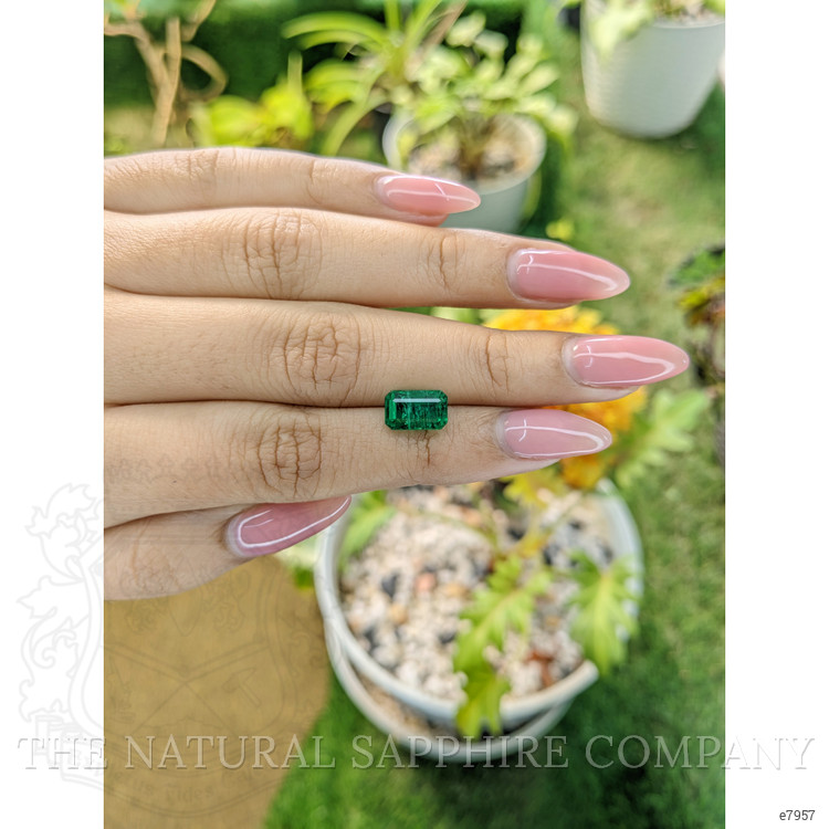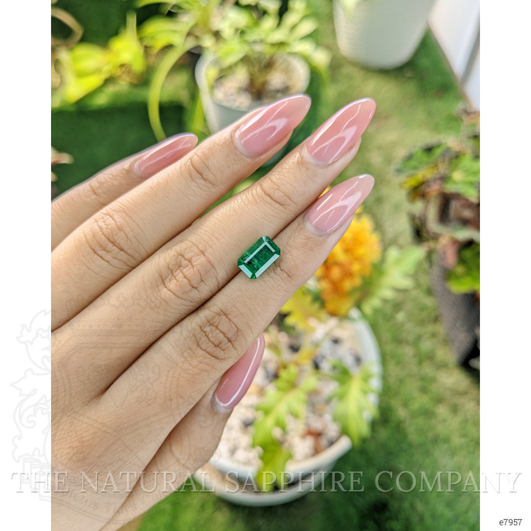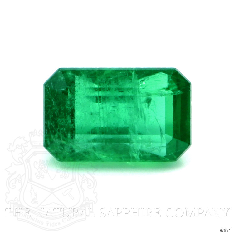 The emerald cut is a step cut that enhances this stone’s inherent properties of light reflection by emphasizing broad, flat facets and long, parallel facet lines that act as reflective planes. Instead of producing a dispersed scintillation like brilliant cuts, the step faceting creates deep, even flashes of light and a hall of mirrors effect that reveals the stone’s color saturation and internal structure with clarity and depth. The modest table and well controlled pavilion depth balance light return and color concentration, so the intense green appears even and stable across the face, while the excellent polish maximizes crisp internal reflections and clean facet junctions. Because there is no enhancement, the cut is calibrated to showcase the natural intensity rather than mask it, allowing the step facets to direct light into and back out of the body color, enhancing perceived saturation. The result is an elegant, measured brilliance that highlights the emerald’s color depth and transparency, renders inclusions in a manner that can be aesthetically integrated into the stone’s character, and provides strong reflective planes that suit both contemporary and traditional mounting styles.