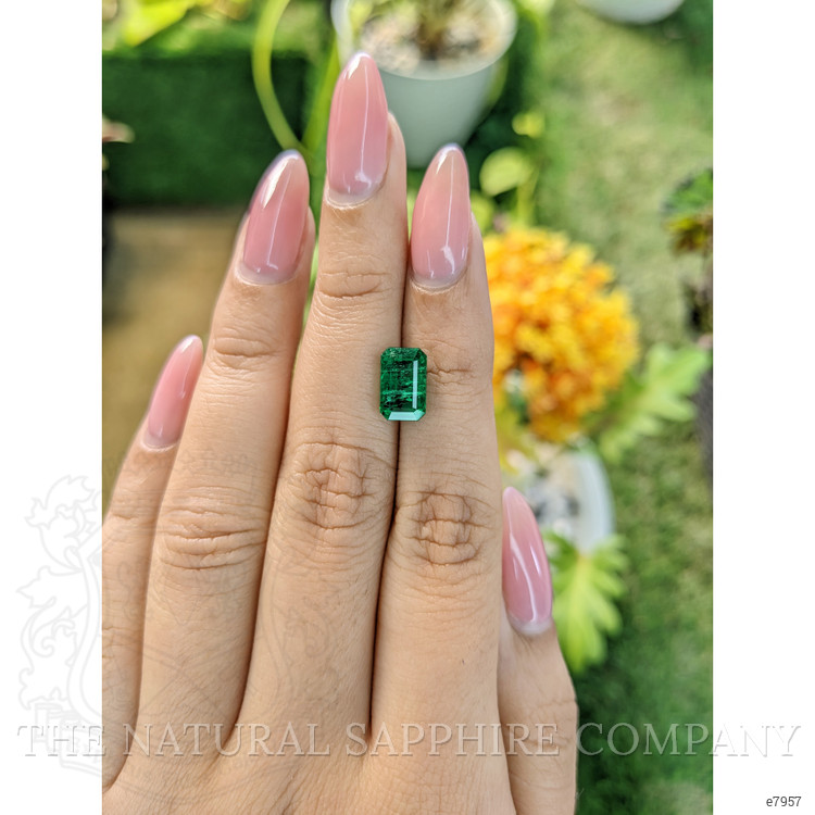This transparent, Other certified Zambian emerald from The Natural Emerald Company weighs 2.55 carats and measures 9.66 by 6.13 by 5.59 millimeters. The stone exhibits an intense green color, an emerald cut outline, and a clarity grade of slightly included when viewed at eye level. The cutting and finishing parameters include an excellent polish and no enhancement, preserving the natural character of the material. The rectangular emerald cut with clipped corners yields a clean face up presentation, the internal features and natural inclusions are consistent with untreated Zambian material, and the overall dimensions give a substantial visual presence relative to its weight, making the gem suitable for classical ring settings or bespoke jewelry where proportion and color are primary considerations.