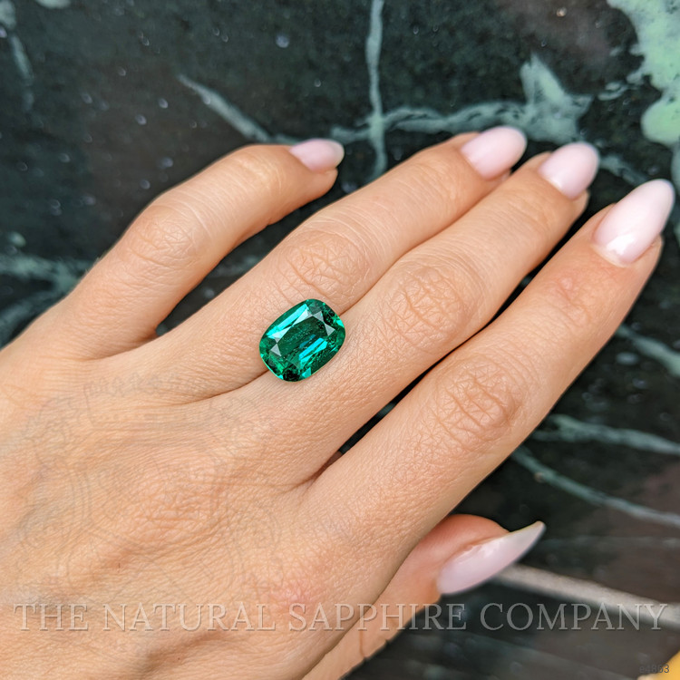 In the lush embrace of verdant landscapes, where the whispering winds and ancient earth conspire to craft nature's most exquisite secrets, lies a 4.32 carat emerald, its presence a testament to the age-old artistry of the earth. Nestled within it is a world, a veritable dreamscape born from the heart of Zambia, where this remarkable gemstone first embraced the gentle kiss of the sun. Its form, a cushion-shaped embrace, speaks to both the continuity and elegance of nature's finest creations, each angle honed by time and tenderness to reveal a brilliance that can only be described as truly celestial.
