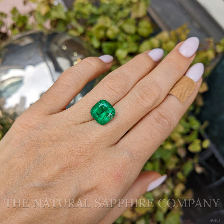The emerald measures 10.70 by 10.65 by 6.89 millimeters, its form a testament to nature's insistence on perfection. With a cushion shape and a weight of precisely 4.44 carats, this jewel embodies the concept of rarity. Watching over its formation, the Earth and her ancient dance paved the way for a masterpiece, carving this gem with a clarity graded as slightly included. When finally revealed, its vivid color intensity instantly captivates the beholder's gaze. Its green hue, as deep and pure as the lush Colombian rainforests from which it came, echoes the mineralogical heritage that defines its origin.