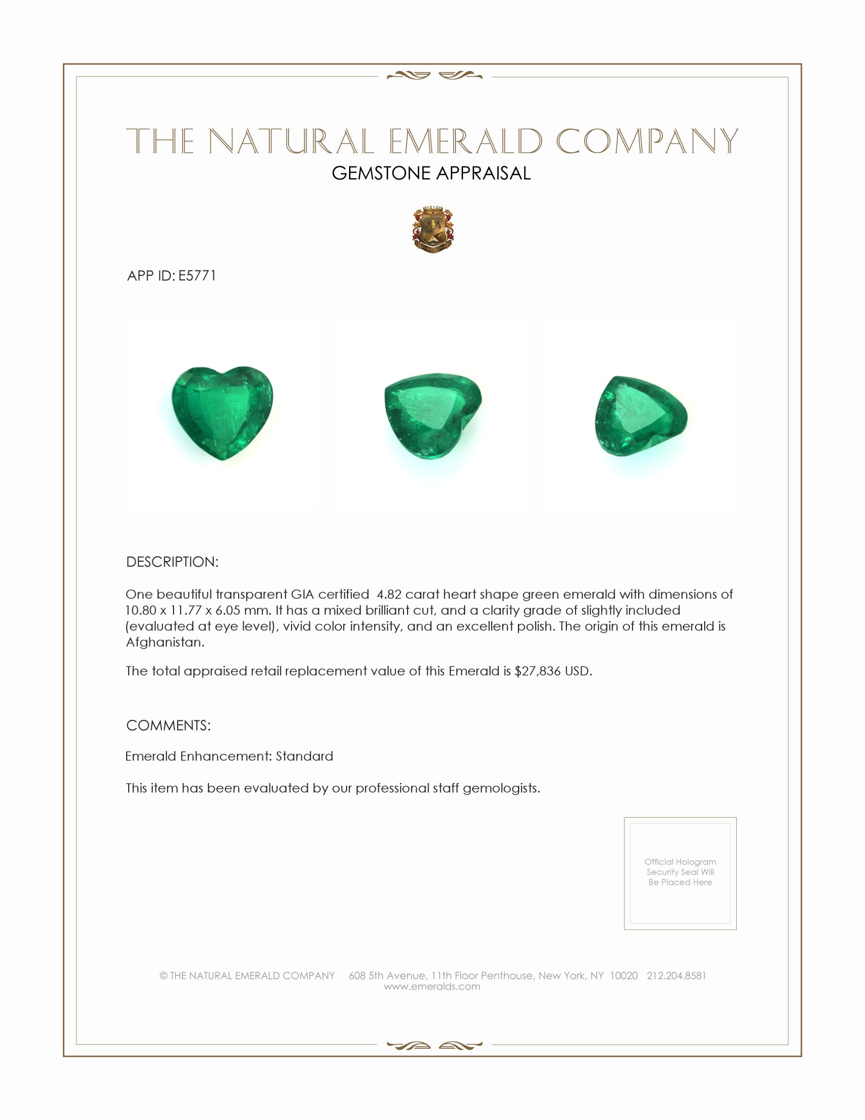 Set amidst a landscape of timeless elegance, this exquisite emerald, certified by the Gemological Institute of America, captures the romantic spirit that melds antiquity with vibrant allure. The Natural Emerald Company proudly presents a gemstone that embraces the heart's deepest desires, with a transparent green emerald that is a testament to Earth’s artistry, sculpted over eons beneath Afghan soil. This heart-shaped jewel, weighing a remarkable 4.82 carats and measuring 10.80 by 11.77 by 6.05 millimeters, is a verdant symphony composed of nature's vibrant brushstrokes. Its mixed brilliant cut radiates passion, dancing in the light like nature's own ballet, while the vivid color intensity invites one into its depths, whispering secrets of ancient tales and romantic fables.