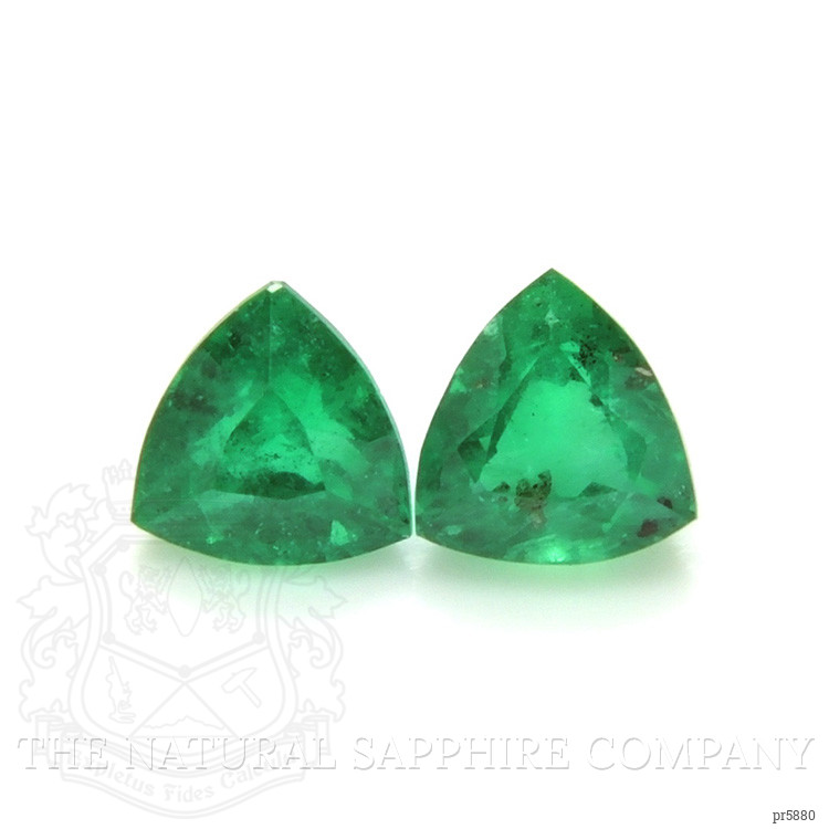 The beautiful, transparent pair of emeralds are 0.18 carats and 0.20 carats respectively. They are trillion shape green emeralds, with the dimensions of 3.58 x 3.54 x 2.42 mm and 3.71 x 3.56 x 2.57 mm and are trillion cut, have a clarity grade of slightly included (evaluated at eye level), intense color intensity, and an excellent polish. The origin of this pair of emeralds is Zambia.