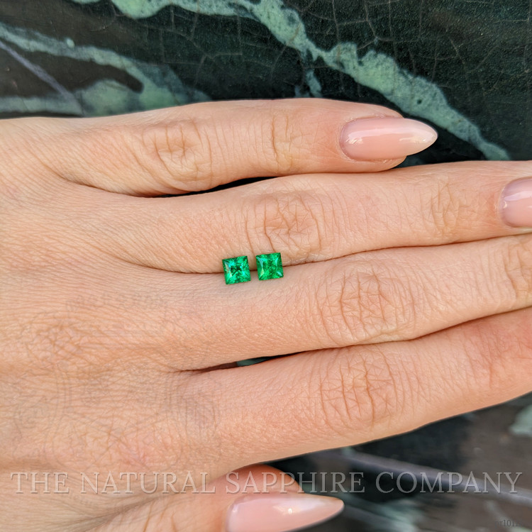 Introducing an exquisite twin set of emeralds from The Natural Emerald Company, where technical precision meets the allure of nature's rare creations. This remarkable pair, weighing 0.33 carats and 0.34 carats respectively, embodies the pinnacle of gemstone craftsmanship. Cut to perfection in a princess shape, each emerald displays astounding dimensions of 4.05 x 4.03 x 3.13 mm and a petite companion sizing at 1.00 x 1.00 x 1.00 mm. The princess cut, renowned in the gemstone world, maximizes the inherent brilliance of these gems, creating a symphony of light and color that captivates at every angle.