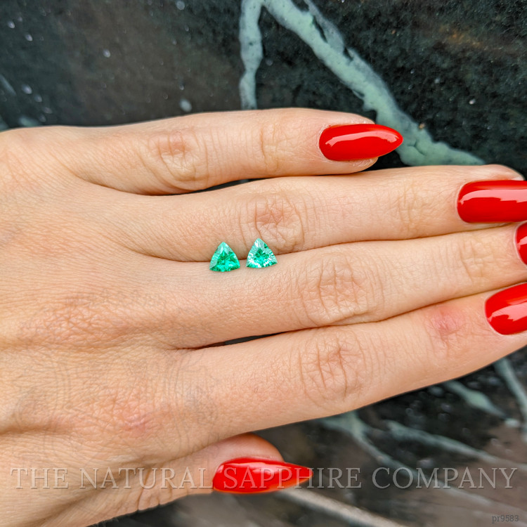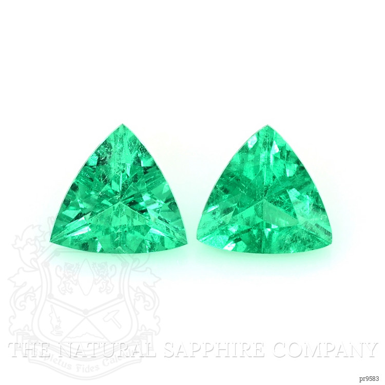 At The Natural Emerald Company, we pride ourselves on offering gemstones that merge exquisite beauty with unparalleled ethical standards. Our highlighted pair of trillion-shaped emeralds each weighing 0.41 carats, exemplifies this commitment. These green treasures are sourced from the renowned mines of Colombia, celebrated worldwide for producing some of the finest gemstones. With dimensions of 5.40 x 5.69 x 3.12 mm and 5.52 x 5.73 x 3.01 mm, these emeralds boast a stunning dark color intensity and an excellent polish, underlining their superior quality. Unlike many alternatives on the market, each stone is meticulously graded as very slightly included at eye level, meaning your investment is visibly clear and pristine.