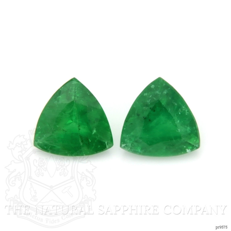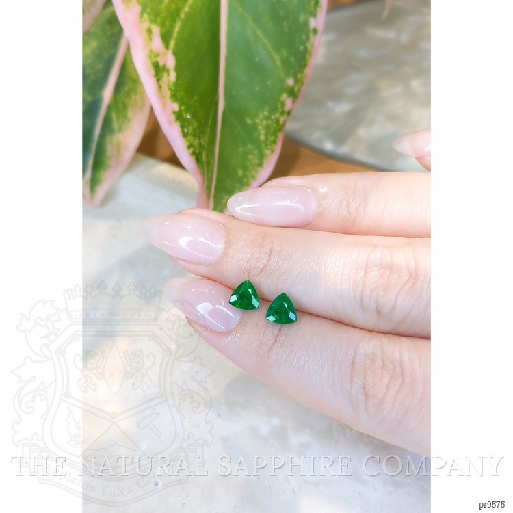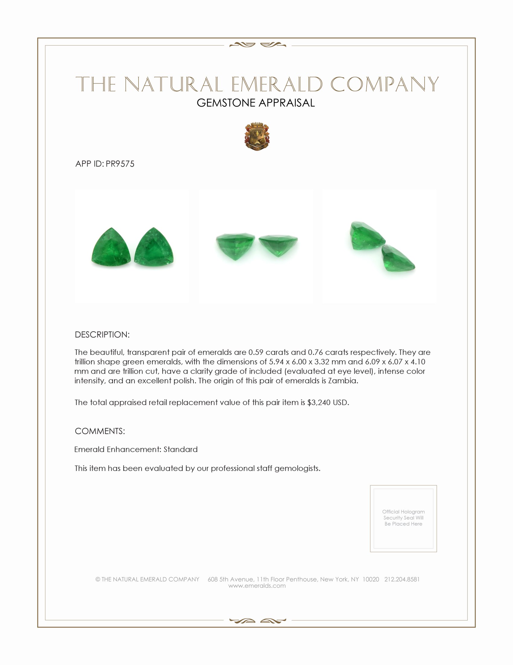 Each emerald, a marvel in its own right, holds within it the history of forgotten eras, kissed by the Zambian sun. Measuring 0.59 and 0.76 carats, these trillion-shaped gems form a harmonious pair, mirroring the perfect balance of two souls united in love. With dimensions that capture light at every angle, they sparkle with an intensity that rivals the very essence of hope. Their excellent polish and intense color speak of a reverence for nature's artistry, leaving a mark on the heart as eternal as the sky.