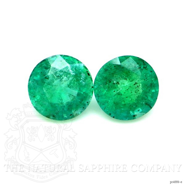 The beautiful, transparent pair of emeralds are 0.83 carats and 0.77 carats respectively. They are round shape green emeralds, with the dimensions of 6.13 x 6.07 x 4.10 mm and 6.08 x 5.94 x 3.94 mm and are mixed brilliant cut, have a clarity grade of slightly included (evaluated at eye level), light color intensity, and an excellent polish. The origin of this pair of emeralds is Zambia.