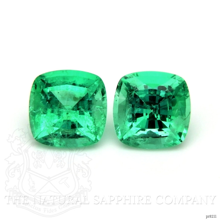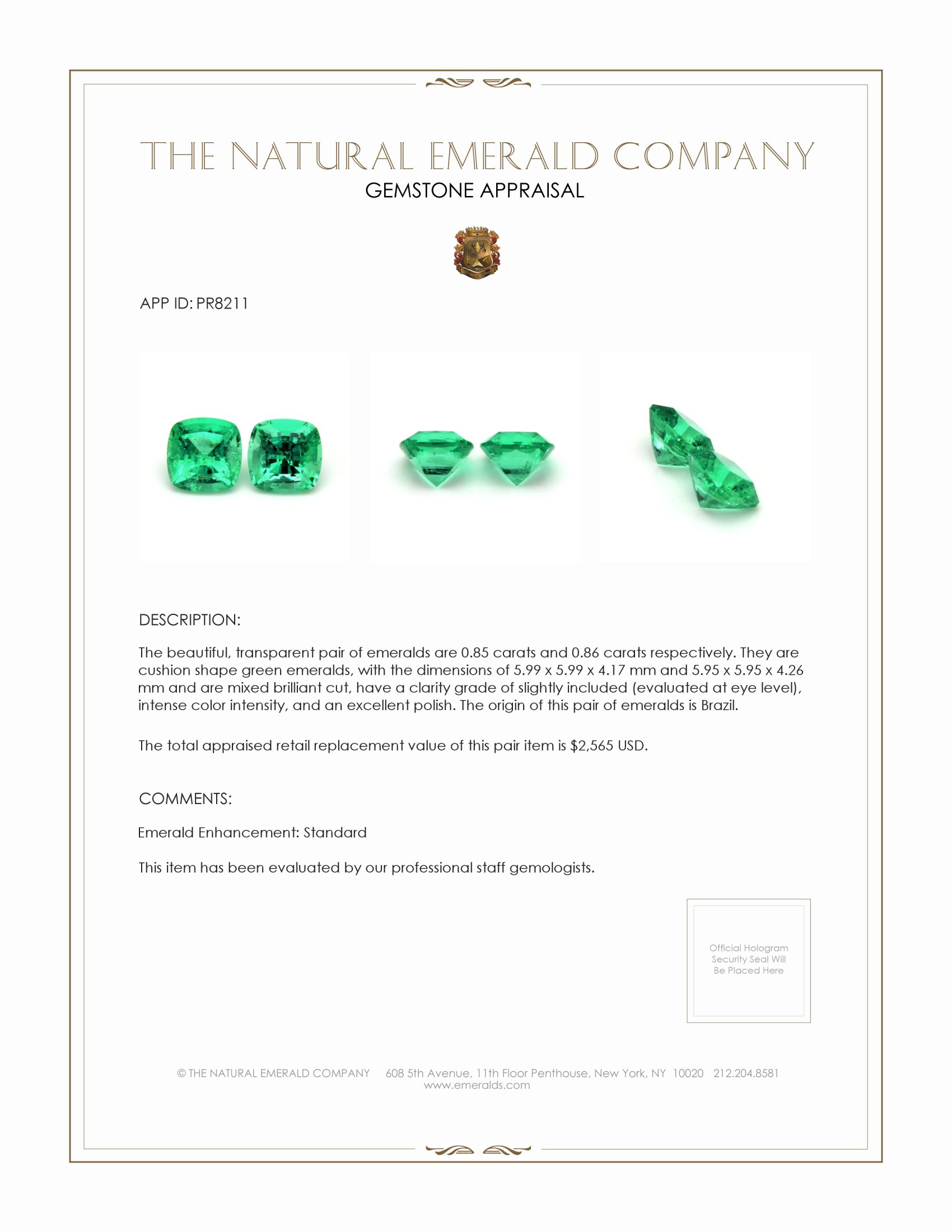 The pair includes a 0.85-carat and a 0.86-carat emerald, each crafted to perfection with a mixed brilliant cut that enhances their innate brilliance. Their enchanting, cushion shapes offer a modern twist to a classic design, making them ideal for those who cherish timeless elegance. With dimensions of 5.99 x 5.99 x 4.17 mm and 5.95 x 5.95 x 4.26 mm respectively, these gems provide the perfect balance between presence and grace. You will discover that these emeralds are slightly included, evaluated at eye level, providing them with an intense color intensity that breathes life into their vibrant green hues.