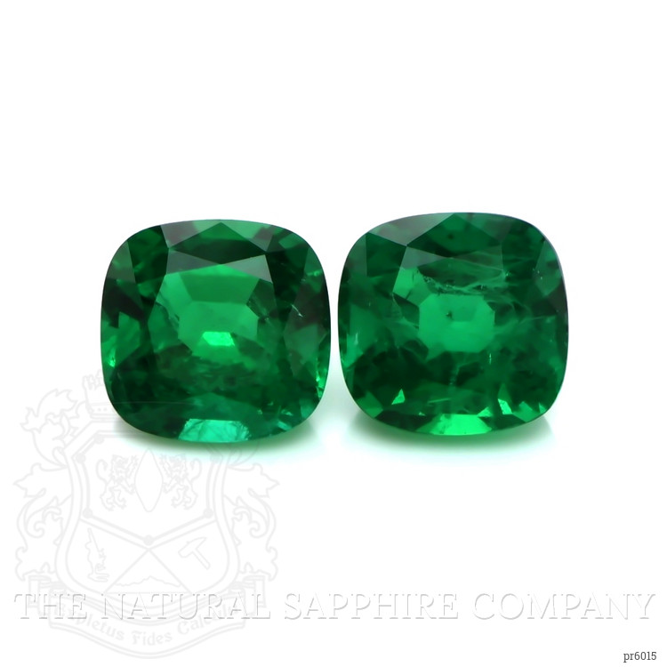 The beautiful, transparent pair of emeralds are 5.77 carats and 6.44 carats respectively. They are cushion shape green emeralds, with the dimensions of 11.38 x 11.07 x 7.36 mm and 11.39 x 11.01 x 8.04 mm and are mixed brilliant cut, have a clarity grade of very slightly included (evaluated at eye level), vivid color intensity, and an excellent polish. The origin of this pair of emeralds is Zambia.