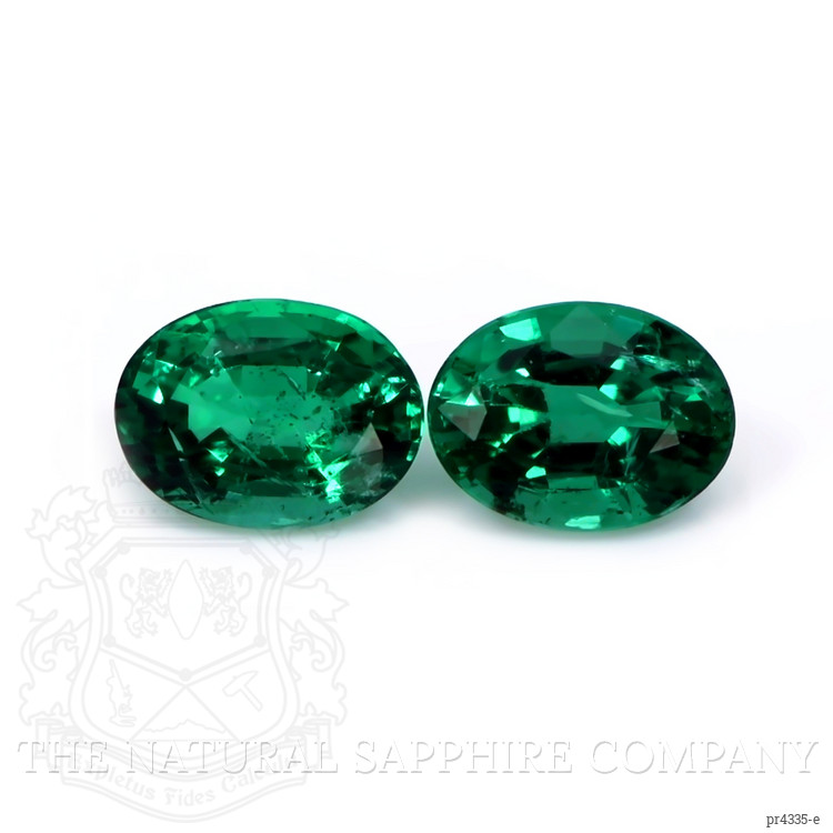 The beautiful, transparent pair of emeralds are 1.21 carats and 1.31 carats respectively. They are oval shape green emeralds, with the dimensions of 8.10 x 6.05 x 4.41 mm and 8.15 x 6.06 x 4.41 mm and are mixed brilliant cut, have a clarity grade of very slightly included (evaluated at eye level), medium color intensity, and an excellent polish. The origin of this pair of emeralds is Zambia.