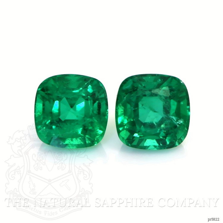 The beautiful, transparent pair of emeralds are 1.37 carats and 1.40 carats respectively. They are cushion shape green emeralds, with the dimensions of 6.67 x 6.58 x 5.04 mm and 6.54 x 6.51 x 5.18 mm and are mixed brilliant cut, have a clarity grade of very slightly included (evaluated at eye level), vivid color intensity, and an excellent polish. The origin of this pair of emeralds is Zambia.