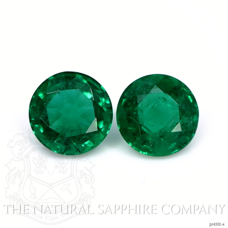 The beautiful, transparent pair of emeralds are 1.92 carats and 1.67 carats respectively. They are round shape green emeralds, with the dimensions of 7.99 x 7.90 x 4.95 mm and 7.92 x 7.81 x 4.67 mm and are mixed brilliant cut, have a clarity grade of slightly included (evaluated at eye level), vivid color intensity, and an excellent polish. The origin of this pair of emeralds is Zambia.