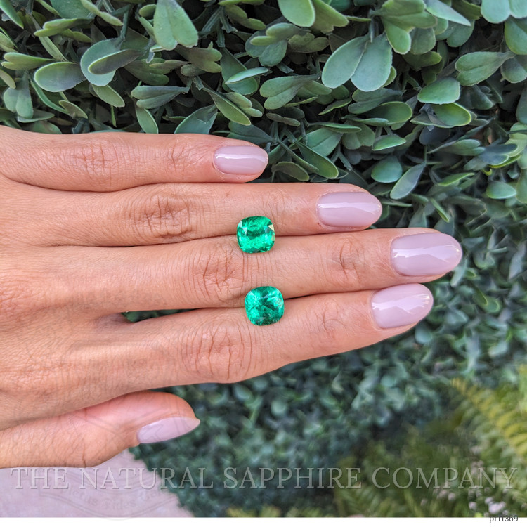 Introducing an exquisite pair of emeralds offered by The Natural Emerald Company, two captivating gems that promise to add unparalleled elegance and brilliance to any collection. These cushion-shaped emeralds—at 2.48 carats and 2.84 carats—are prime examples of Colombian excellence. Sourced from the legendary mines of Colombia, renowned for producing the most illustrious emeralds in the world, these gems bear a vivid green color intensity that is both alluring and majestic. Their dimensions, 8.69 x 8.37 x 5.81 mm and 8.79 x 8.67 x 6.36 mm respectively, showcase the skill in cutting and shaping that brings out their natural beauty. Enjoy the classic appearance that marries contemporary design with ageless charm, particularly evident in their mixed brilliant cut that enhances their reflective qualities.