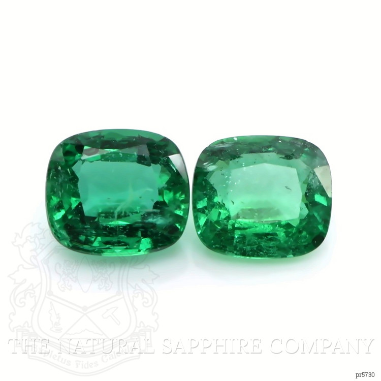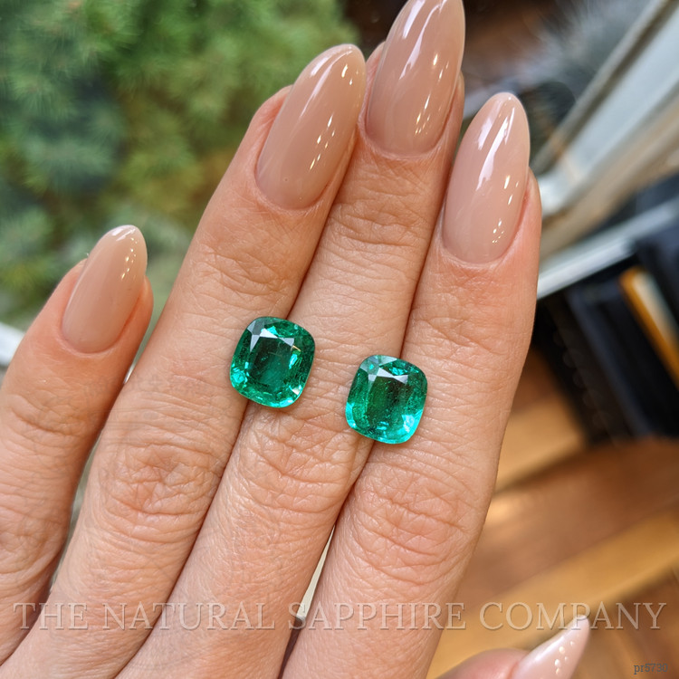 The beautiful, transparent pair of emeralds are 2.75 carats and 3.30 carats respectively. They are cushion shape green emeralds, with the dimensions of 9.55 x 8.59 x 4.98 mm and 9.82 x 8.74 x 5.57 mm and are mixed brilliant cut, have a clarity grade of very slightly included (evaluated at eye level), intense color intensity, and an excellent polish. The origin of this pair of emeralds is Zambia.