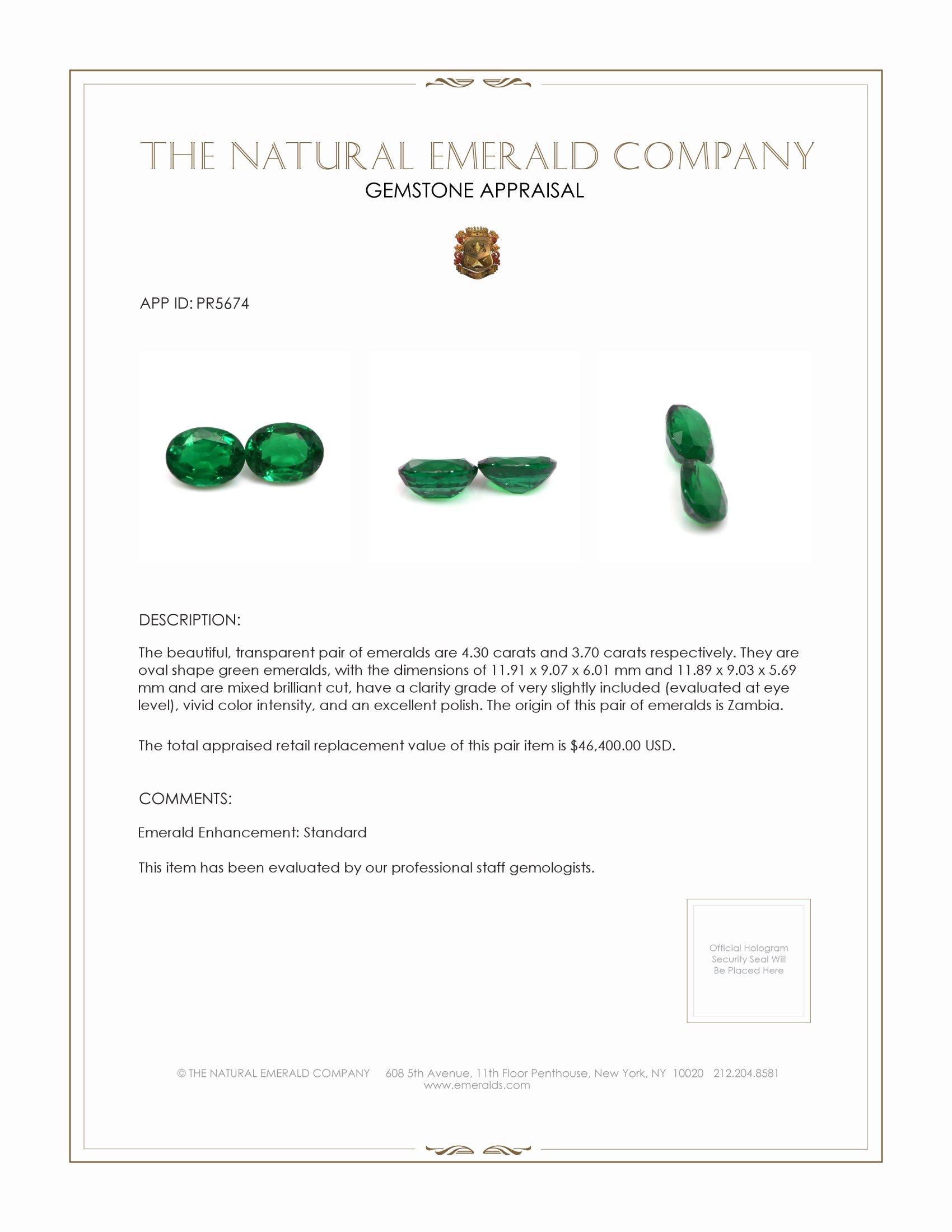 The beautiful, transparent pair of emeralds are 4.30 carats and 3.70 carats respectively. They are oval shape green emeralds, with the dimensions of 11.92 x 9.08 x 6.05 mm and 11.91 x 9.01 x 5.74 mm and are mixed brilliant cut, have a clarity grade of very slightly included (evaluated at eye level), vivid color intensity, and an excellent polish. The origin of this pair of emeralds is Zambia.