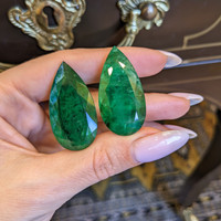Encompassing a magnificent total of 91.08 carats, these pear-shaped marvels each offer their own distinct charms yet unite as one in an emerald embrace. The first gemstone, a striking 43.89 carats, partners with the second, an equally mesmerizing 47.19 carats, reflecting dimensions that speak of grandeur—35.66 x 18.43 x 12.46 mm and 35.79 x 18.60 x 12.09 mm, respectively. Crafted with a mixed brilliant cut, their excellence is displayed in the way light adorns them with an intense green flamboyance, imbuing the wearer's story with passion and noble allure. Despite a clarity grade of included, these jewels' inner worlds are filled with the captivating wonder that beckons exploration.
